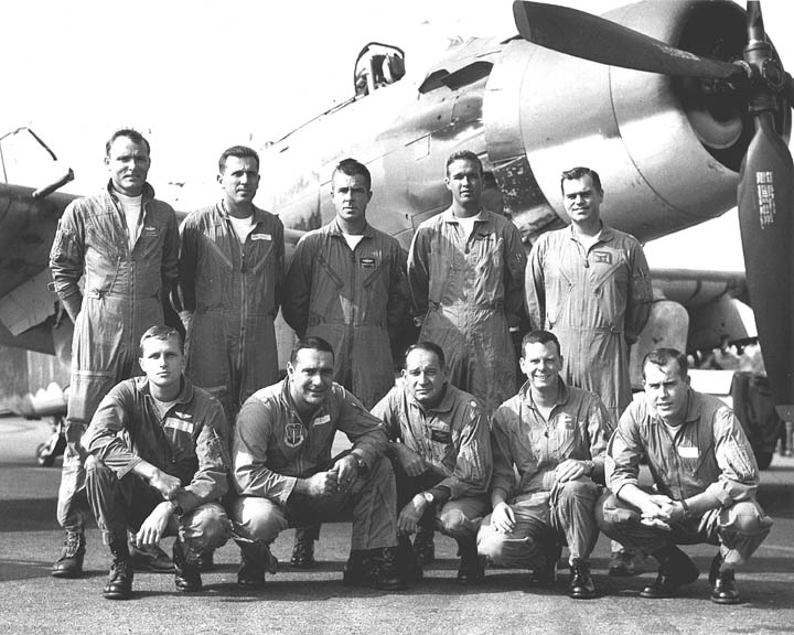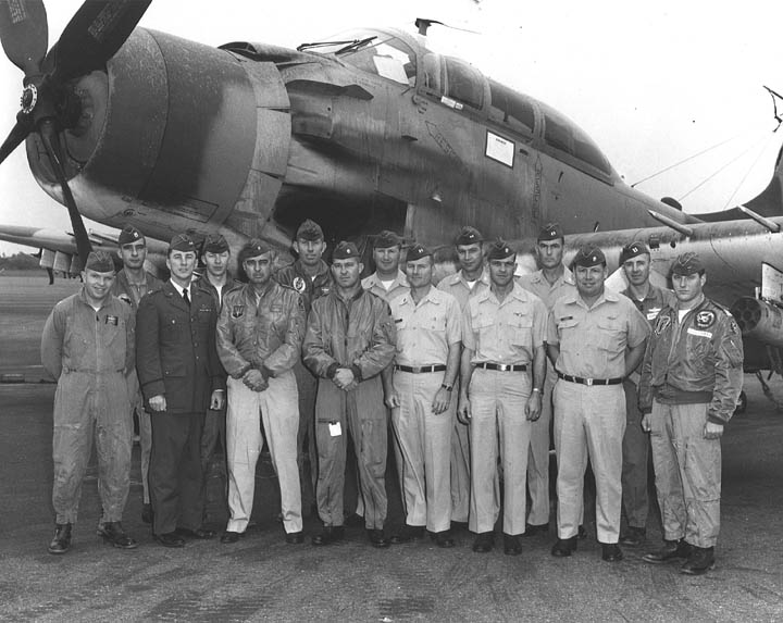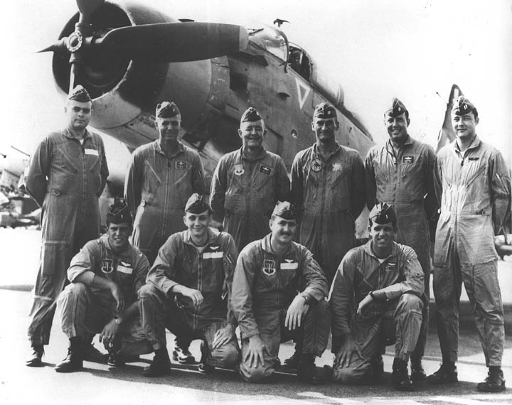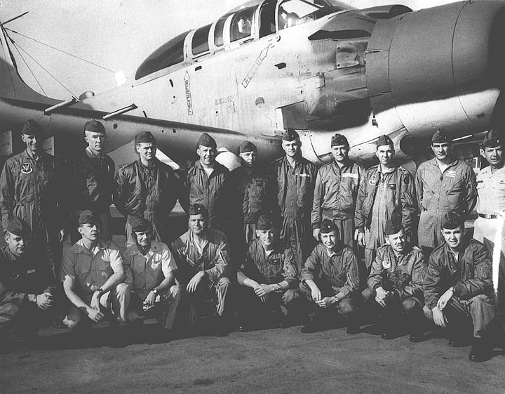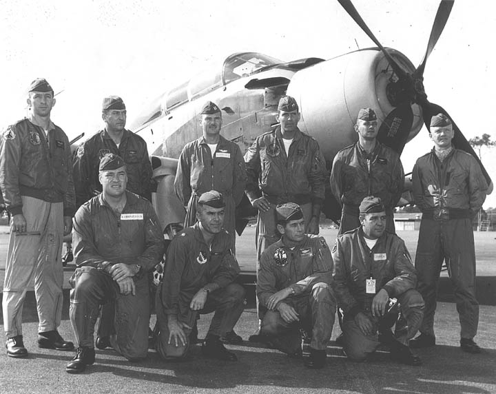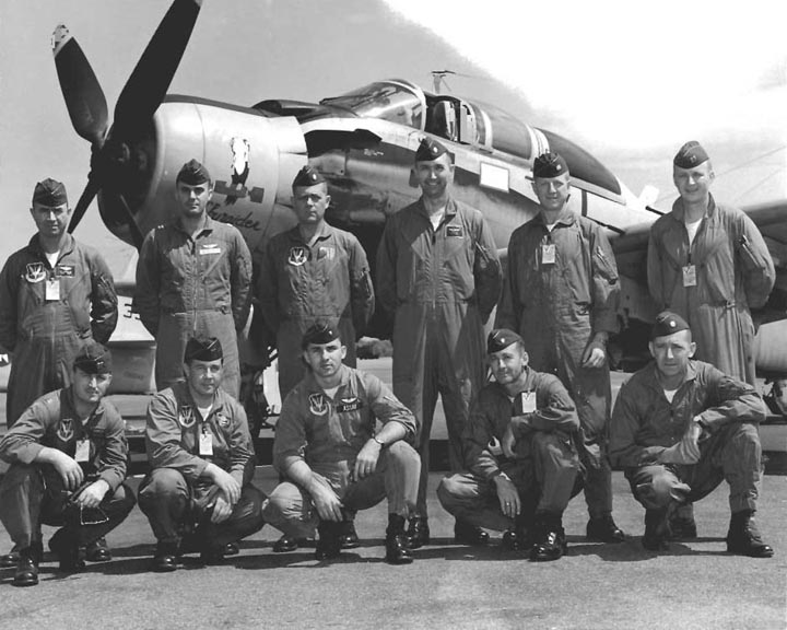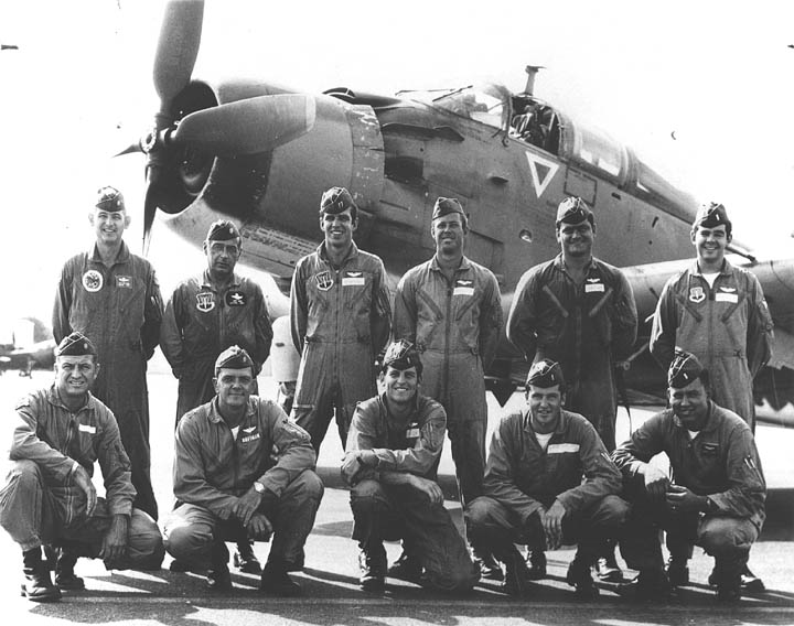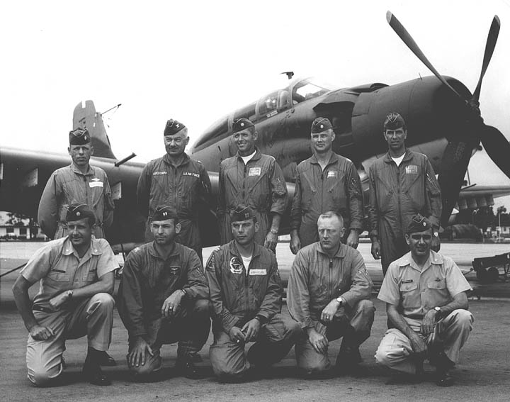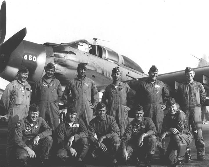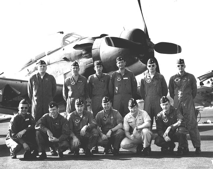 Back row: Capt Thomas Hubert Wolfe (MIA in A-26, 66/06/28) , Capt CB 'Ben' Skelton, Capt RP Rosecrans, Capt Jimmie R Crane (1993/06), Capt H. Lewis 'Lew' Smith, Capt Richard C 'Dick' Needham, Capt Glenn G. Givens (1983/07/11) Front row: Capt JT McDaniels, Capt Alan P. Weber, Capt James V. Loven, Capt Bill Spillane, Capt Leo S. Boston (KIA 66/04/29) NP/I: LtCol Richard H. 'Dick' Erickson, LtCol WC Thomas, Maj JL Johnson |