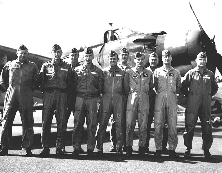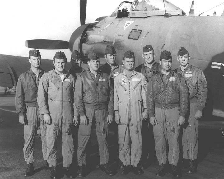 Back row: Maj Wilber A. 'Will' Darsey, Capt Bruce M. Wallace, Maj Lewis S. 'Lew' Daugherty, Capt Win E. 'Windy' DePoorter, Capt Fredrick J. 'Rick' Larabee, Capt Richard R. 'Dick' Roehm Front row: Capt Richard H. McManigell, Capt James B. 'Jim' Wheeler, Capt Ronald M. 'Ron' Canter (KIA 65/12/08), Capt John I. 'Luke' Lucas |
