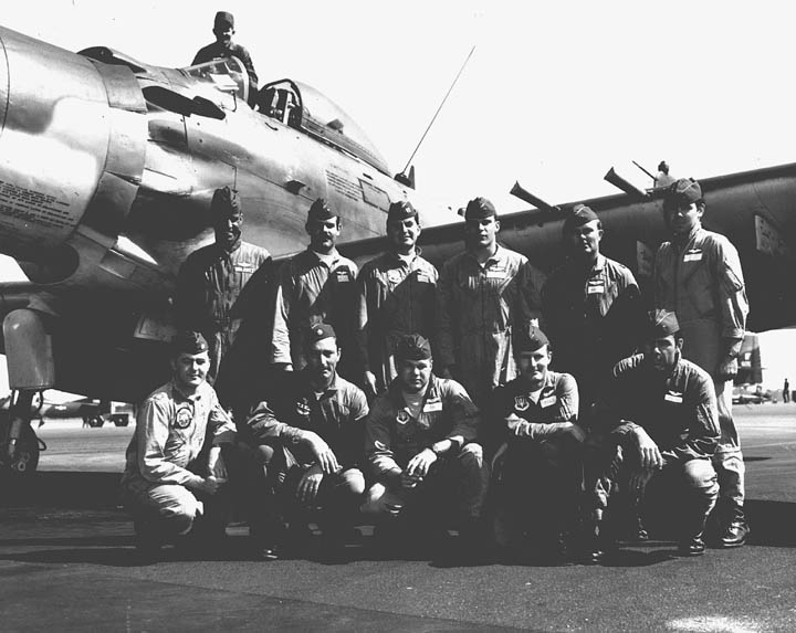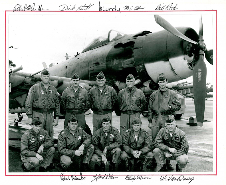 Back row: Capt A.C. 'Tony' Markl (2012/04/11), Capt R.A. Campbell, 1Lt George E. Flynn III (KIA 64/09/23), Capt Walter L. Dixon, Capt M.C. Heath (deceased), Capt Morgan C. Pummill Front row: Capt Clyde Evans (IP) (1993/02), Col Heinie Aderholt (2010/05/20), Capt Walter G. 'Thunder' Harris, Maj Eugene Lancaster, Capt William Y. 'Bill' Duggan (KIA in F-4, 71/12/31) NP/I: LtCol J.M. Porter, Capt B.L. Steinbach |