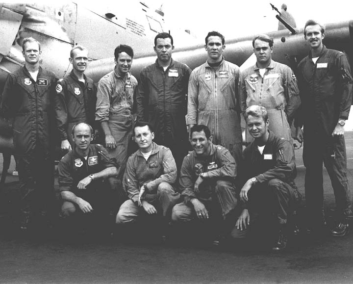 Back row: Capt R.E .Blood, Capt Sig Dahl, Capt A.E. Byars, Capt T.D. Pulham (deceased 2004?), Capt David L. Elliot, Capt D.R. Houck, Capt James T. 'Jim' Bales, LtCol Lynwood E. Clark, Capt N.J. Baker, Capt E.E. Cravens Front row: Capt B.G. Bays, Capt Paco Vazquez, Lt Ken L Blankenship (1970/11), Capt Raymond H. "Buddy" Hetrick (KIA 66/02/24), Capt J.W. 'Bill' Prescott, Maj J.R. Dennett |