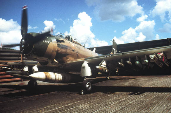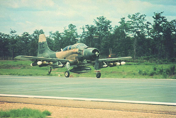 What: 3/4 front view a USAF A-1E, armed prior to a tactical strike mission.