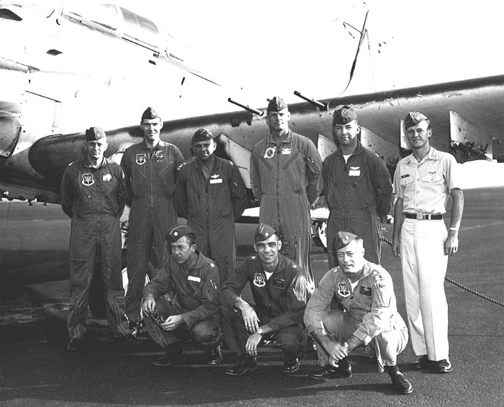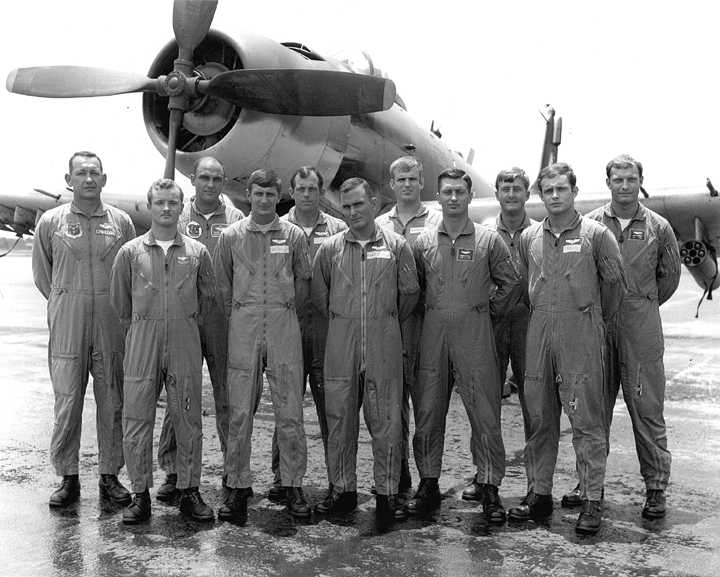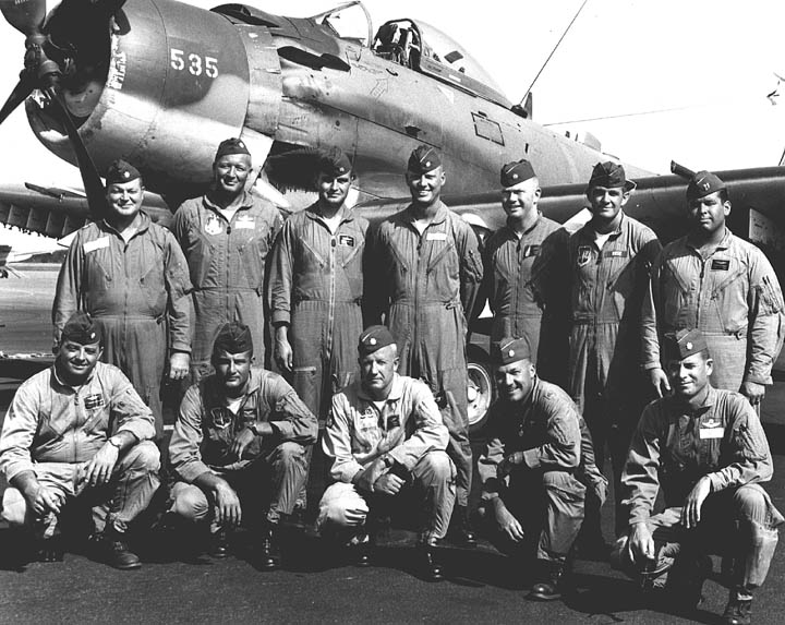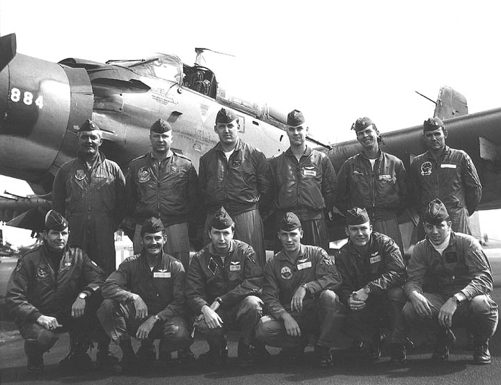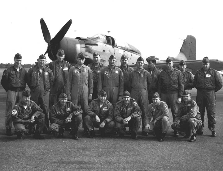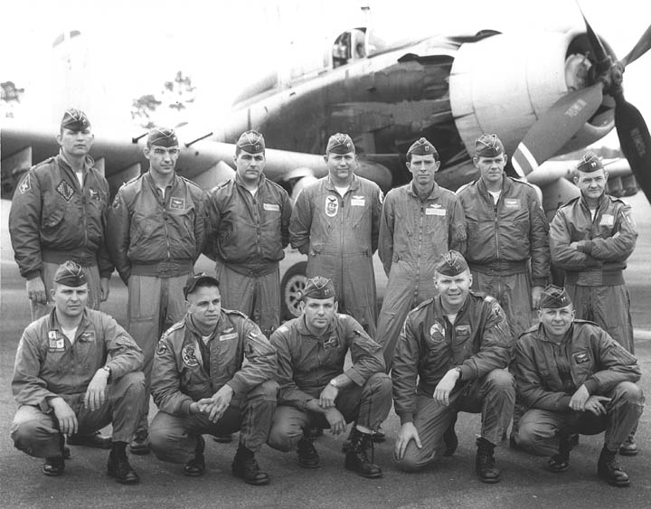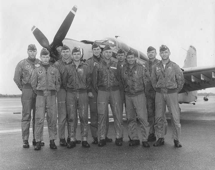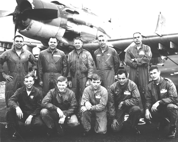 Back row: Capt Thomas Hubert Wolfe (MIA in A-26, 66/06/28) , Capt CB 'Ben' Skelton, Capt RP Rosecrans, Capt Jimmie R Crane (1993/06), Capt H. Lewis 'Lew' Smith, Capt Richard C 'Dick' Needham, Capt Glenn G. Givens (1983/07/11) Front row: Capt JT McDaniels, Capt Alan P. Weber, Capt James V. Loven, Capt Bill Spillane, Capt Leo S. Boston (KIA 66/04/29) NP/I: LtCol Richard H. 'Dick' Erickson, LtCol WC Thomas, Maj JL Johnson |