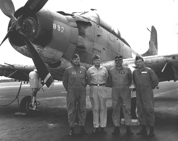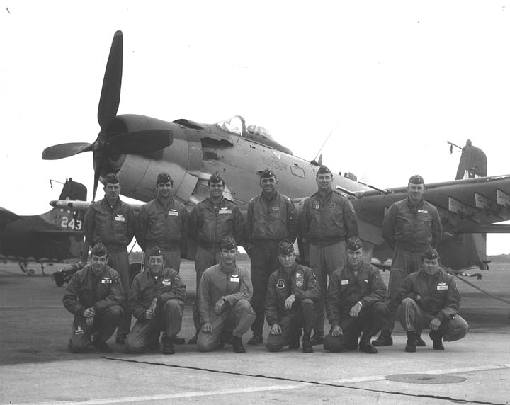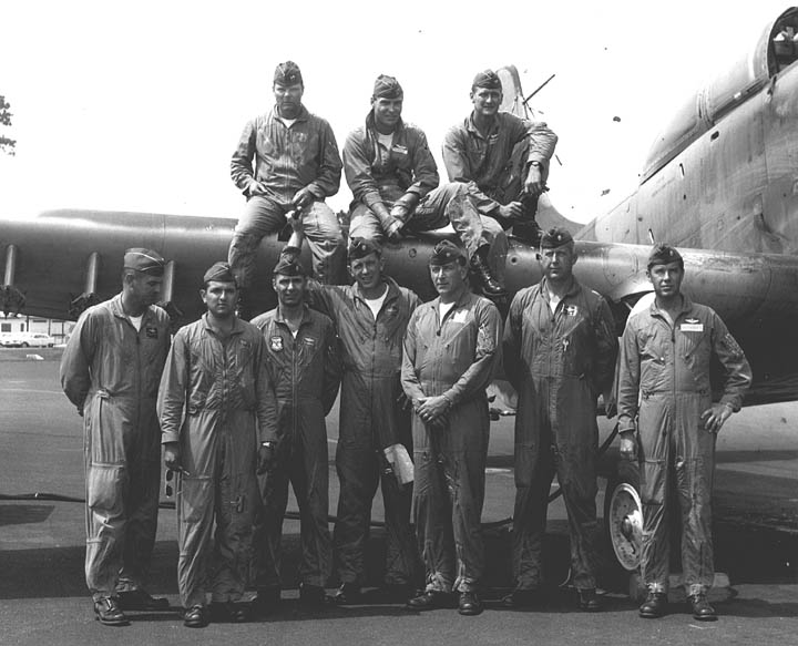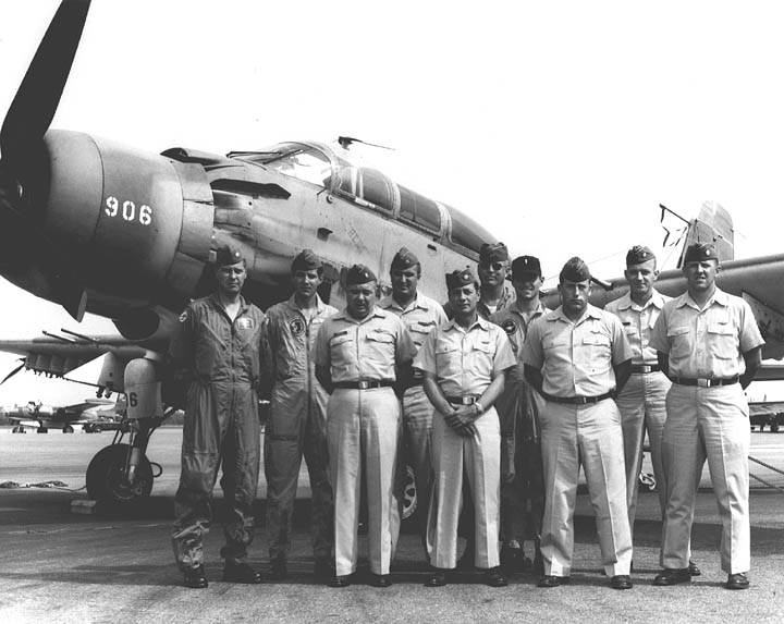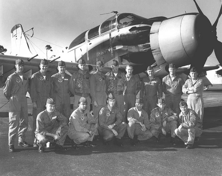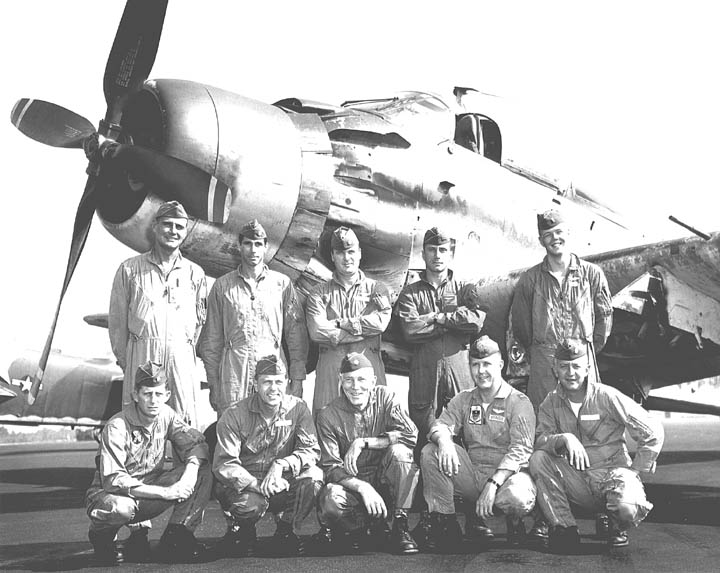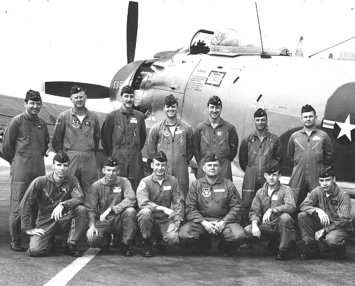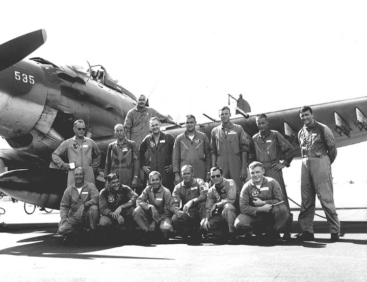 Back row: Capt Thomas Hubert Wolfe (MIA in A-26, 66/06/28) , Capt CB 'Ben' Skelton, Capt RP Rosecrans, Capt Jimmie R Crane (1993/06), Capt H. Lewis 'Lew' Smith, Capt Richard C 'Dick' Needham, Capt Glenn G. Givens (1983/07/11) Front row: Capt JT McDaniels, Capt Alan P. Weber, Capt James V. Loven, Capt Bill Spillane, Capt Leo S. Boston (KIA 66/04/29) NP/I: LtCol Richard H. 'Dick' Erickson, LtCol WC Thomas, Maj JL Johnson |