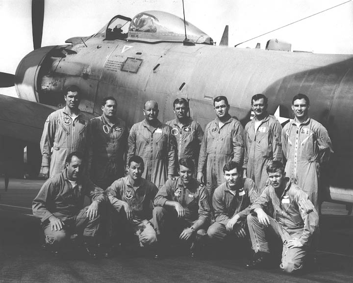 Back row: Maj Wilber A. 'Will' Darsey, Capt Bruce M. Wallace, Maj Lewis S. 'Lew' Daugherty, Capt Win E. 'Windy' DePoorter, Capt Fredrick J. 'Rick' Larabee, Capt Richard R. 'Dick' Roehm Front row: Capt Richard H. McManigell, Capt James B. 'Jim' Wheeler, Capt Ronald M. 'Ron' Canter (KIA 65/12/08), Capt John I. 'Luke' Lucas |
