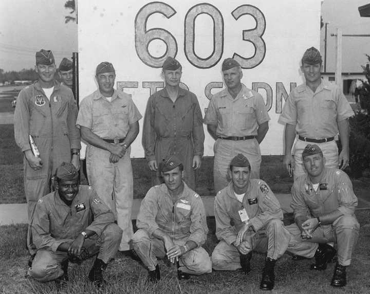 Back row: Capt A.C. 'Tony' Markl (2012/04/11), Capt R.A. Campbell, 1Lt George E. Flynn III (KIA 64/09/23), Capt Walter L. Dixon, Capt M.C. Heath (deceased), Capt Morgan C. Pummill Front row: Capt Clyde Evans (IP) (1993/02), Col Heinie Aderholt (2010/05/20), Capt Walter G. 'Thunder' Harris, Maj Eugene Lancaster, Capt William Y. 'Bill' Duggan (KIA in F-4, 71/12/31) NP/I: LtCol J.M. Porter, Capt B.L. Steinbach |