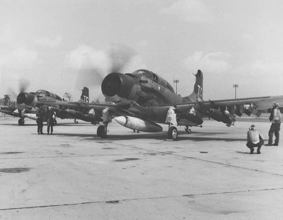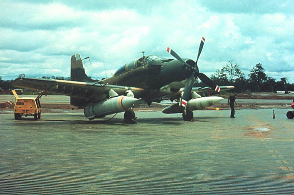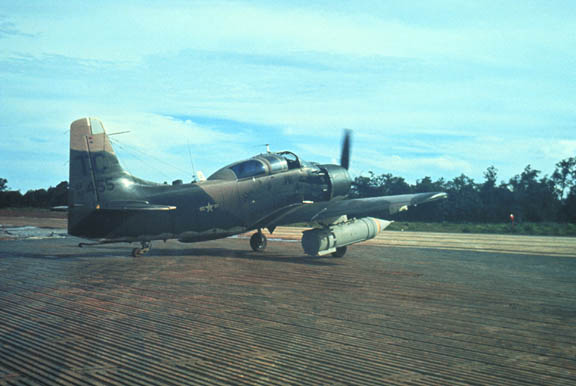 What: 3/4 front view a USAF A-1E, armed prior to a tactical strike mission.